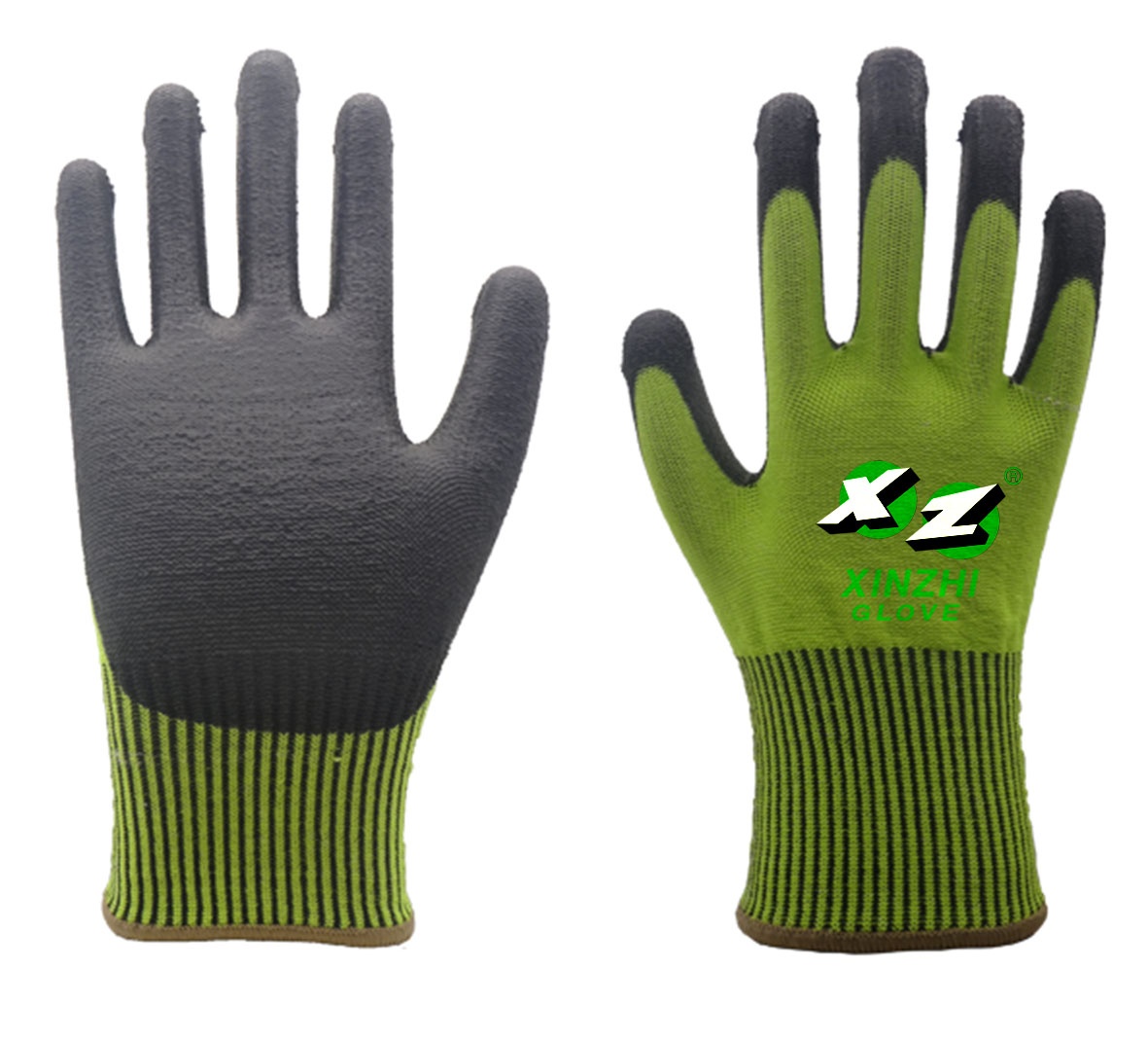 13G Fluorescent Green HPPE/ Polyester/ Glass Fiber / Spandex with Black PU Coating Safety Work Gloves
